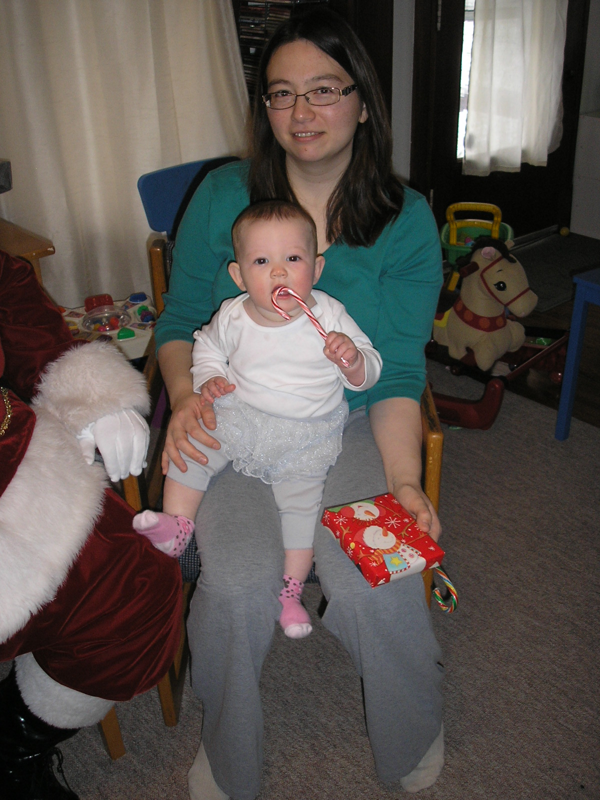Santa was kind enough to visit Saturday to pose for pictures and deliver some Christmas cheer. (Since I had made my fifth botched batch of fudge the night before, I needed it. Not that the visit was for me.) We got Chloë and Maia dressed up and ready. They took a little time to get used to the whole photos idea: